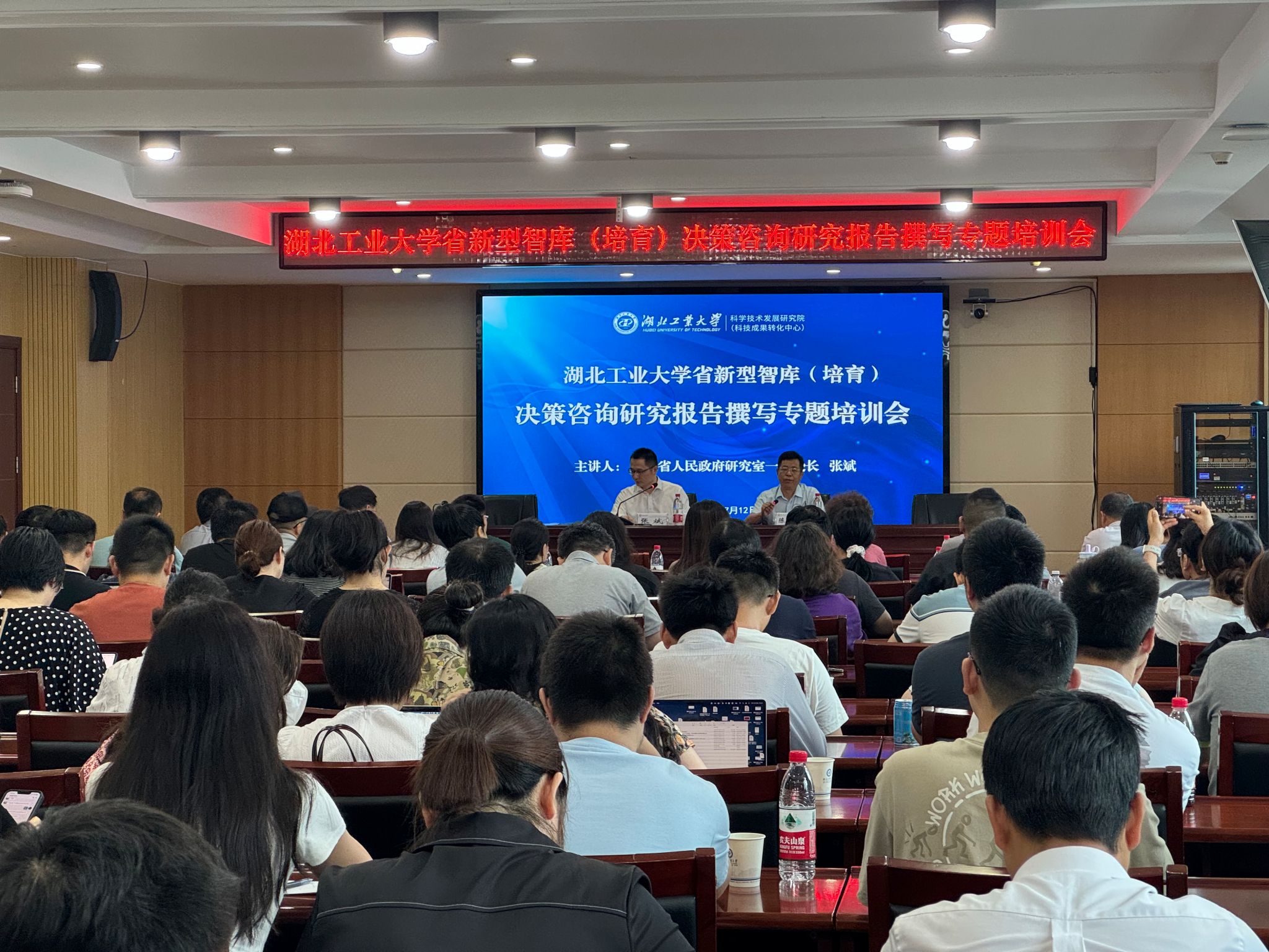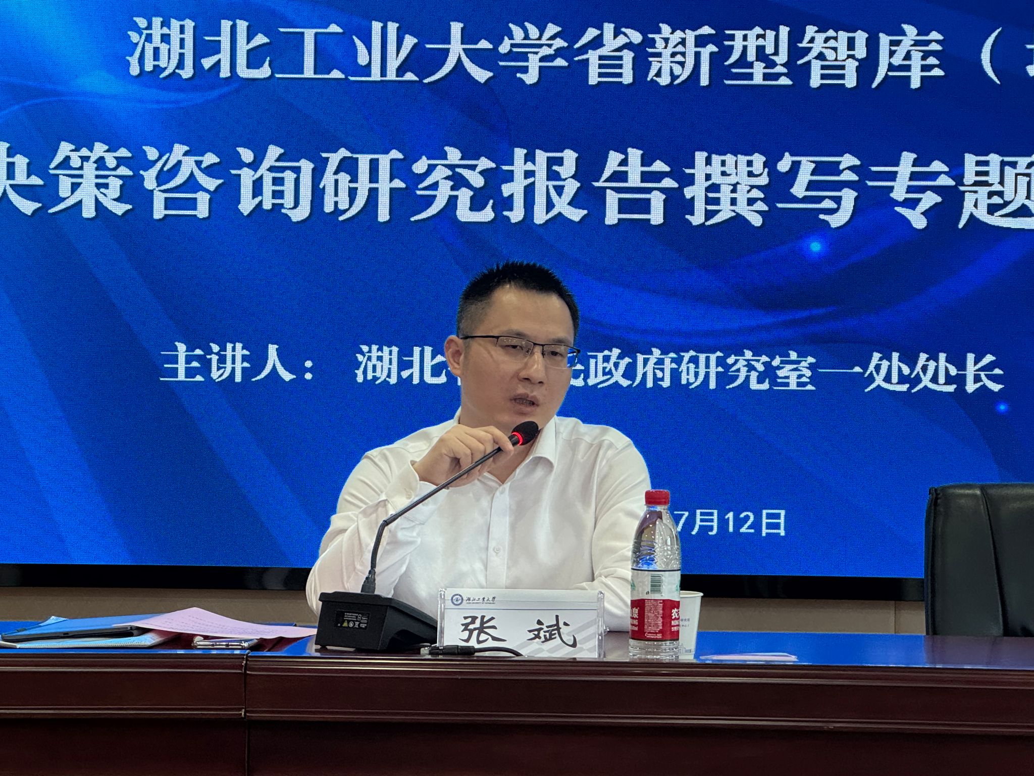 7月12日上午,湖北工业大学省新型智库(培育)决策咨询研究报告撰写专题培训会在行政楼一楼会议室召开,湖北省人民政府研究室一处处长张斌出席会议并作专题辅导,会议由校党委常委、副校长陈自才主持。学校相关职能部门、教学单位负责人和教师代表、科研人员近100人参加培训会。