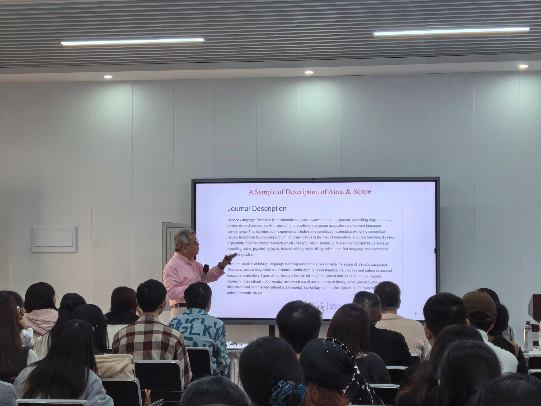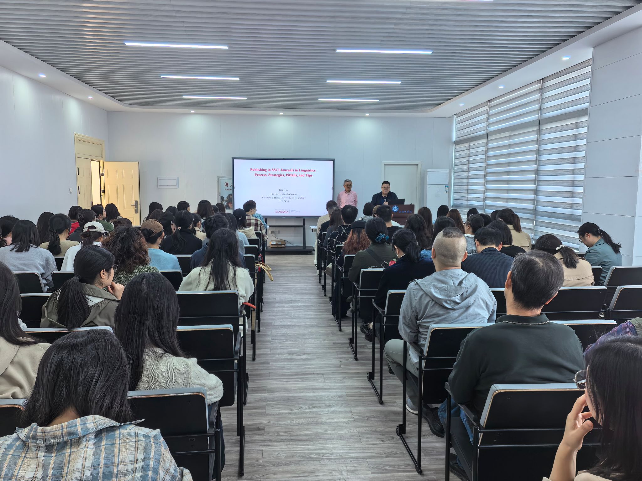 Dr. Dilin Liu教授围绕SSCI期刊论文发表的流程、热点研究主题跟踪与查找、目标期刊检索、严谨的研究设计范式选择和高质量论文撰写等方面,结合丰富的经验和生动的案例,高屋建瓴、深入浅出地阐述了当前学术前沿的热点问题和应用语言学SSCI期刊论文写作与发表的相关议题。他的讲解既具有高度的专业性,又通俗易懂,让在场的师生们受益匪浅。在互动环节,师生们积极提问,Liu教授耐心地一一解答,为师生们在学术研究和专业发展方面提供了宝贵的建议和指导。