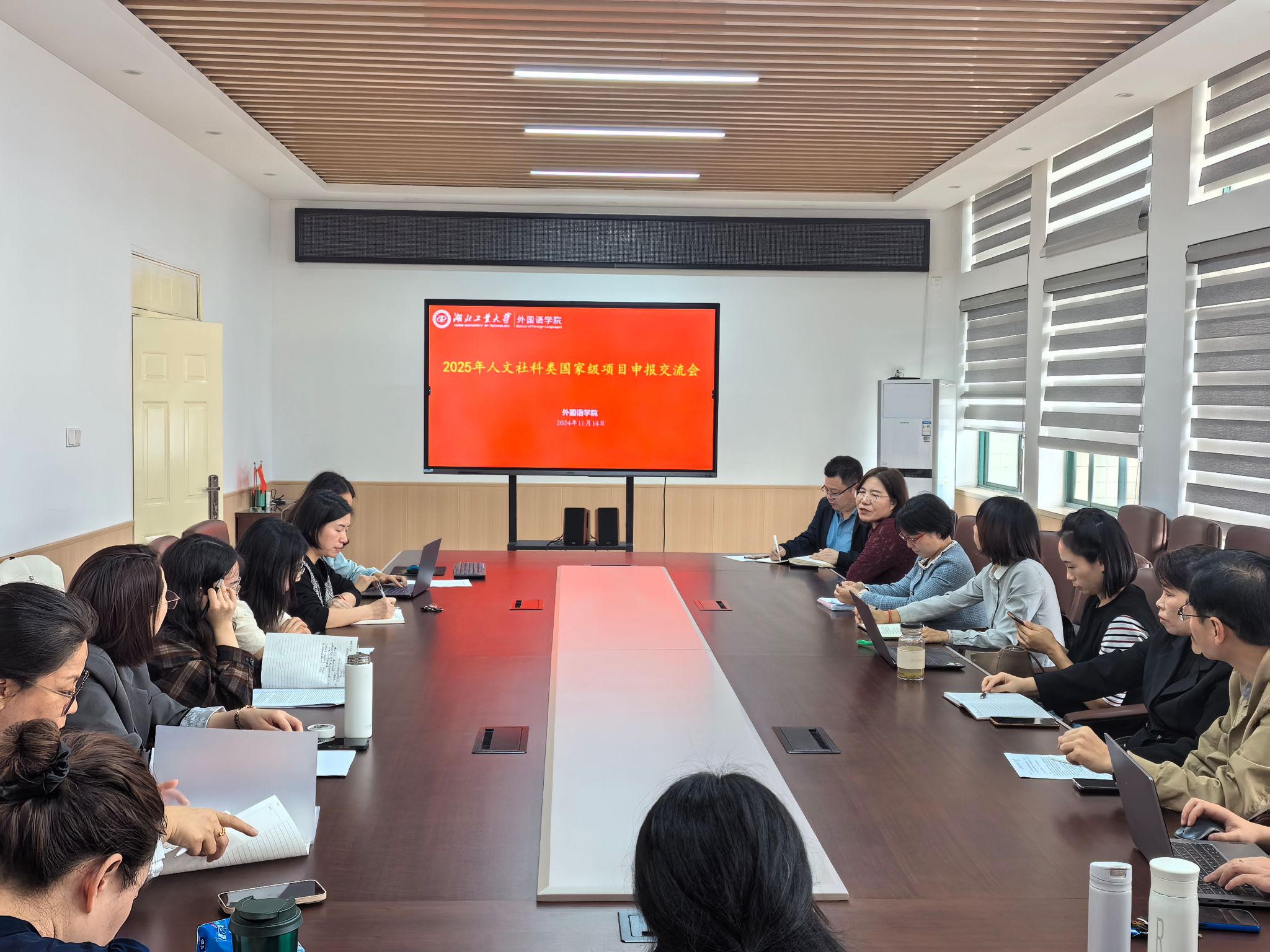 为提高2025年人文社科类国家级项目质量,推进项目申报工作,11月14日下午,外国语学院在文科楼1001会议室召开了2025年项目申报交流会。会议由副院长李池利主持,院长鲁修红、副院长黄广芳出席会议,拟申报2025年国家级项目的教师及近年来获批国家级项目的教师参加了会议。