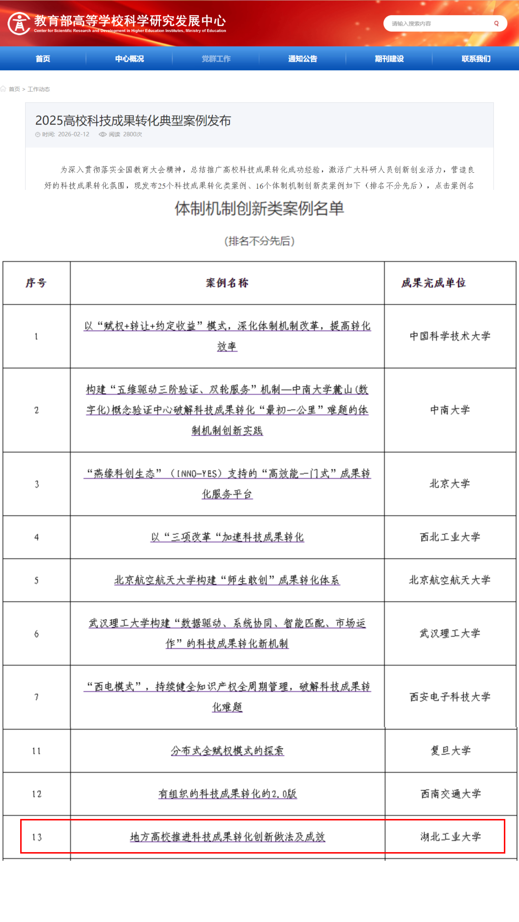 近日,教育部高等学校科学研究发展中心正式发布了“2025高校科技成果转化典型案例”名单。在省教育厅的正确领导和大力支持下,湖北工业大学成功入选“体制机制创新类案例”,这一殊荣标志着湖工大在深化科技体制改革、激发科研创新活力、推动成果转化落地等方面的工作获得了国家级权威认可和高度肯定。
