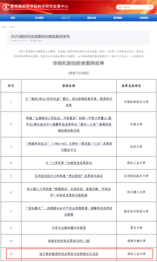 近日,教育部高等学校科学研究发展中心正式发布了“2025高校科技成果转化典型案例”名单。在省教育厅的正确领导和大力支持下,湖北工业大学成功入选“体制机制创新类案例”,这一殊荣标志着湖工大在深化科技体制改革、激发科研创新活力、推动成果转化落地等方面的工作获得了国家级权威认可和高度肯定。