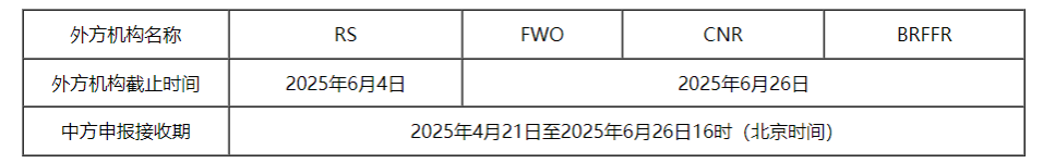 科学基金网络信息系统在线申报接收期以及相应外方资助机构规定的截止时间如下表所示。请申请人注意提醒外方合作者在相应的截止时间前提交申请。