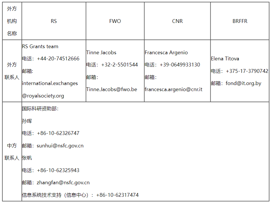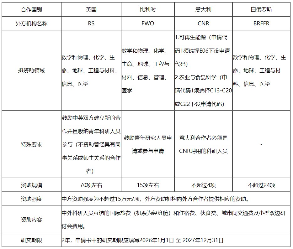 根据国家自然科学基金委员会(NSFC)与英国皇家学会(RS)、比利时弗兰德研究基金会(FWO)、意大利国家研究理事会(CNR)、白俄罗斯基础研究基金会(BRFFR)的合作协议及后续达成的共识,2025年度我委与上述资助机构将继续共同资助中外科研人员之间的合作交流。