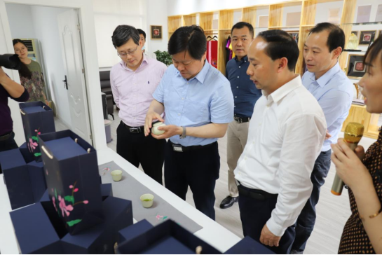 在余德芳书记的陪同下,刘德富书记一行首先参观考察了汉绣产业基地,听取了产业研究院负责人王欣关于大悟汉绣项目的汇报,深入了解了大悟汉绣产业的发展过程、现状、趋势和方向。