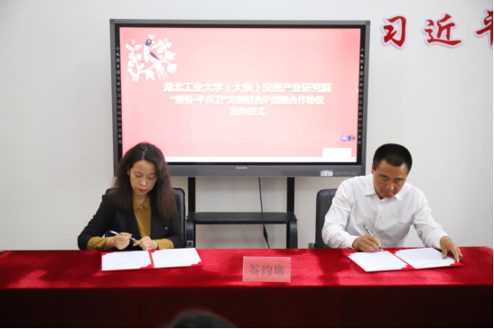 随后,双方举行了汉绣产业研究院合作签字仪式。王欣代表湖北工业大学(大悟)汉绣研究院与湖北半兵卫茶业有限公司签订文创战略合作协议。