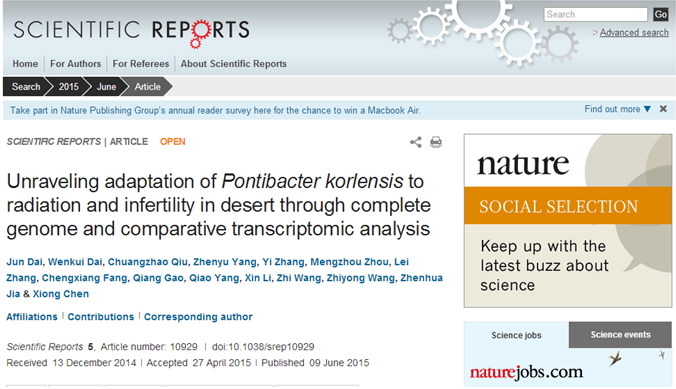 在国家自然科学基金项目资助下,2015年6月9日,轻工学部生物工程学院学院陈雄团队青年教师代俊博士等人在Nature子刊《Scientific Reports》杂志上发表了题为“Unraveling adaptation of Pontibacter korlensis to radiation and infertility in desert through complete genome and comparative transcriptomic analysis”的最新研究成果。(相关链接:)