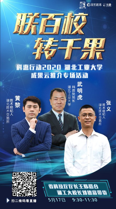 5月17日上午,湖北省科技厅“联百校转千果”科惠行动2020高校成果云推介首场活动——湖北工业大学专场在淘宝、斗鱼、长江云APP三大平台直播,湖北工业大学近400项绿色科技成果吸引52万兴业者围观,2万余企业技术负责人在线上对接并表达竞买意向,12项重点推介成果意向金额达1.76亿元。