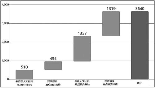 重点研究机构情况。全国各级各类重点研究机构数量达3640个。其中,教育部人文社科重点研究机构510个,其他部委重点研究机构454个,省级人文社科重点研究基地1357个,其他省级重点研究机构1319个。重点研究机构研究人员有14万人。
