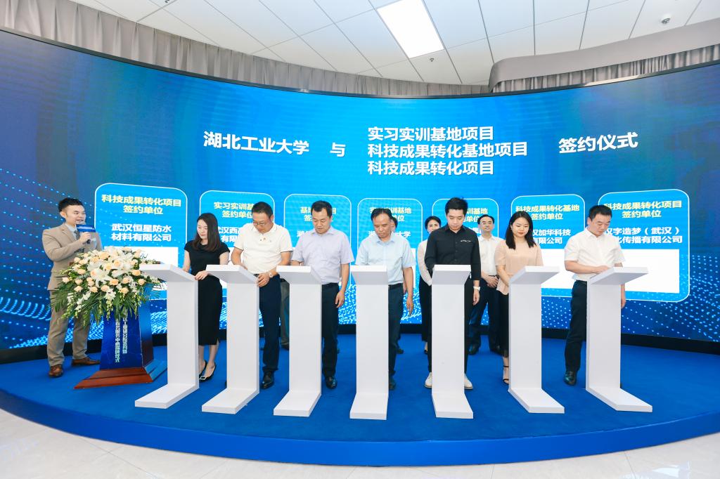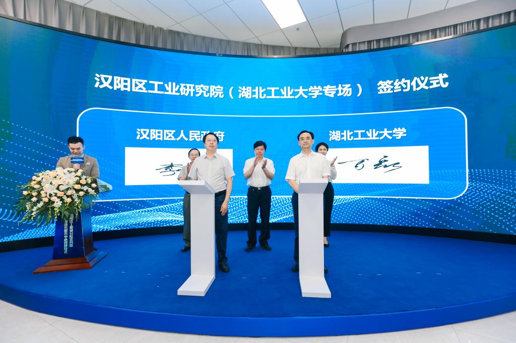 校党委常委、副校长李冬生与汉阳区委常委、区政府常务副区长万磊签订《汉阳区工业研究院共建合作协议》,校教务处、校科学技术发展研究院负责人分别与汉阳区实习实训基地、科技成果转化基地、科技成果转化项目代表签约。