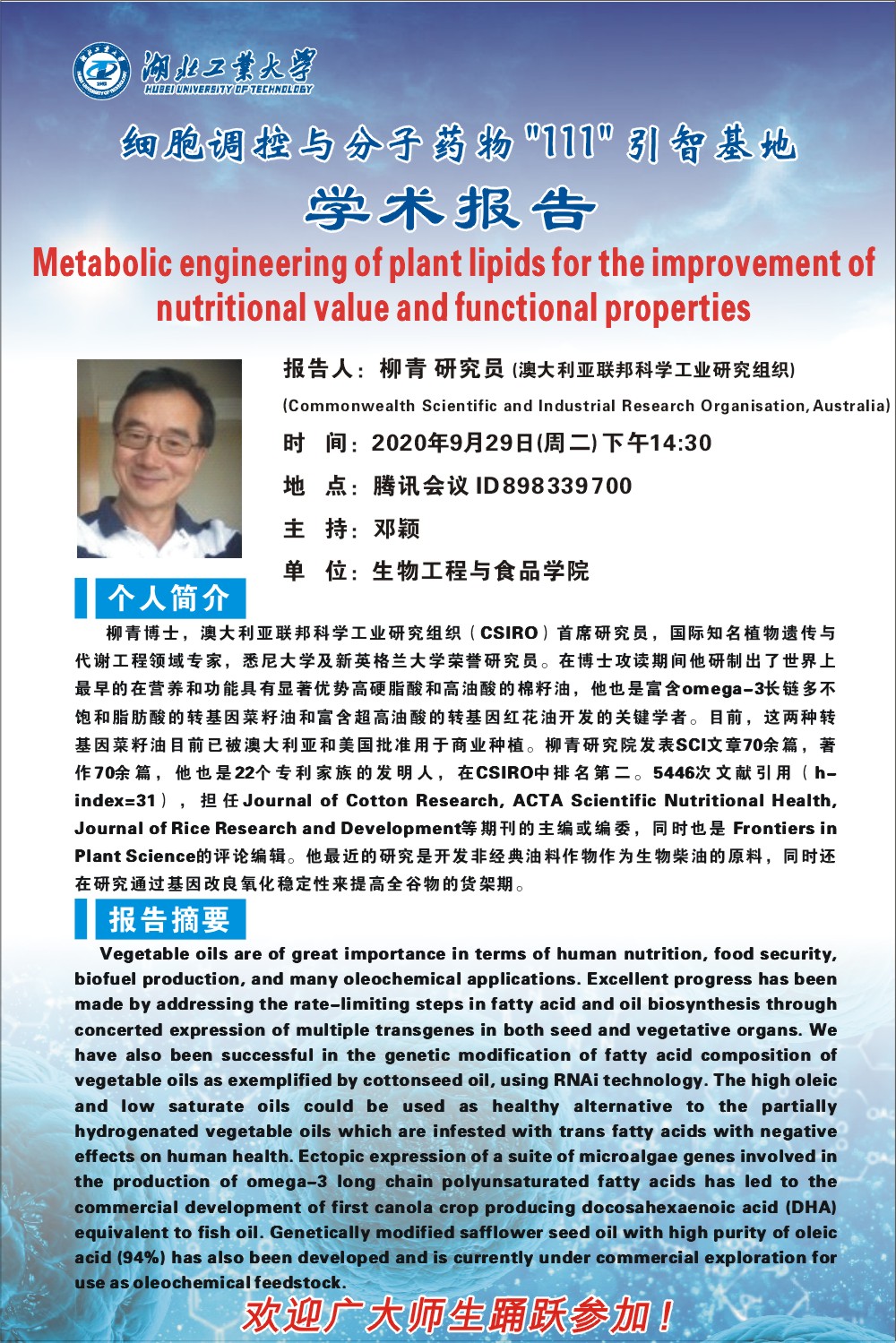 报告人:柳青 研究员 澳大利亚联邦科学工业研究组织(Commonwealth Scientific and Industrial Research Organisation, Australia)
