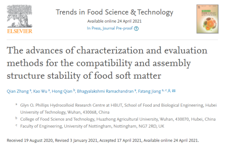 近日,农林科学和食品科学国际顶级期刊《Trends in Food Science&Technology》(《食品科学与技术趋势》,IF:11.077)在线发表了我校生物工程与食品学院食品软物质结构与功能团队在食品复杂体系凝聚态物理实验和理论研究方法方面的最新研究进展,论文题目为:“The Advances of Characterization and Evaluation Methods for the Compatibility and Assembly Structure Stability of Food Soft Matter ”,论文链接:。我校为第一署名单位,本文第一作者为生物工程与食品学院2019级博士研究生张倩,通讯作者为姜发堂教授。该研究得到国家自然科学基金(31972156)、欧盟委员会玛丽居里基金项目(794680)资助。