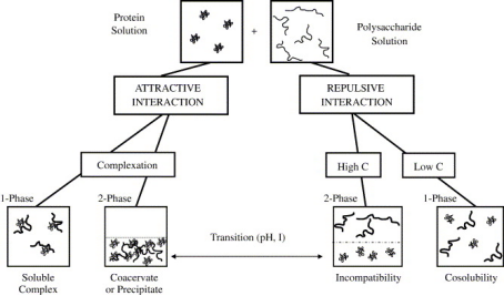 图1软物质分子组装结构示意图 在食品体系中,多糖/蛋白质混合体系已经得到了广泛的研究,但构象变化对混合体系相行为影响的研究还很有限。食品中的多糖和蛋白质在加工和贮藏过程中往往伴随着丰富的构象转变和凝胶行为。利用混合体系的相分离(图2),结合各种分子构象转变和相变,如凝胶化转变、液晶转变等,可以达到丰富食品微观结构和物理性质的目的,结构多元化是解决食品设计瓶颈的重要手段。一些研究已经对相容性和组装结构稳定性的表征方法进行了评价,但这些信息很少系统地被总结。因此,本文从食品作为软物质的角度,介绍了蛋白质与多糖的相互作用及其对微观结构的影响。总结了食品软质组分的相容性、组装结构及其稳定性,以及现有的表征方法。本文总结的信息将有助于为食品软物质的科学研究开发新的研究方法和工具,并对进一步的研究提出展望。